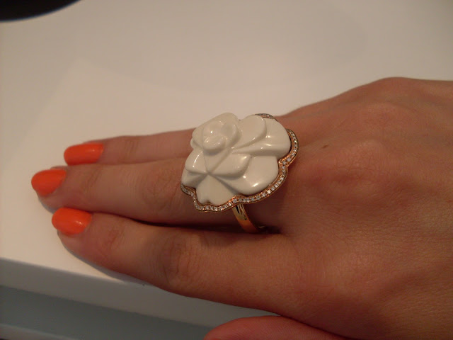 | Kamelia ring: 18k rose gold with white diamonds and white onyx. Retail price: 3.885 eur |