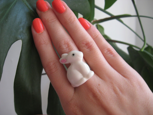 Takođe sam želela da vam pokažem i svoj novi nakit. Kao što možda znate, ponosna sam vlasnica belog zeke pa sam zamolila Aleksandru sa bloga Kreativan nakit da mi napravi prsten i privezak za ključeve u obliku zeca. Dobila sam ih pre par dana i apsolutno sam oduševljena, prsten ne skidam od tada. Takođe mi je napravila i minđuše u obliku parčeta pice (pošto mi je to omiljeno jelo, je l’ te) i mogu vam reći da uživo izgledaju još bolje.
