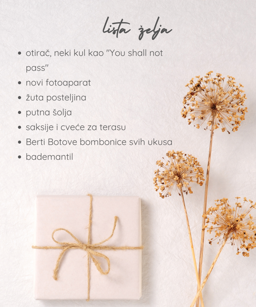 Za kraj, sastavila sam i svoju listu želja za narednu godinu, na koju sam zaboravila da dodam nove bežične slušalice i mekane papuče u kojima se može normalno hodati (a da se stopalo ne krivi u stranu).