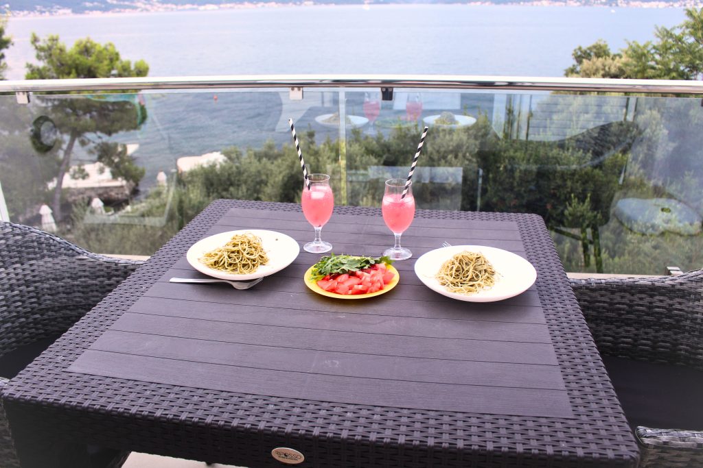 Ove fotografije s terase su nastale oko 8h uveče, tako da svetlo nije najbolje. Đorđe i ja smo tu večerali i pijuckali somersbi kad bismo poslali decu na spavanje, a kada padne mrak, vidite svetla Tivta s druge strane mora kako svetlucaju poput dragog kamenja. Prelepo.